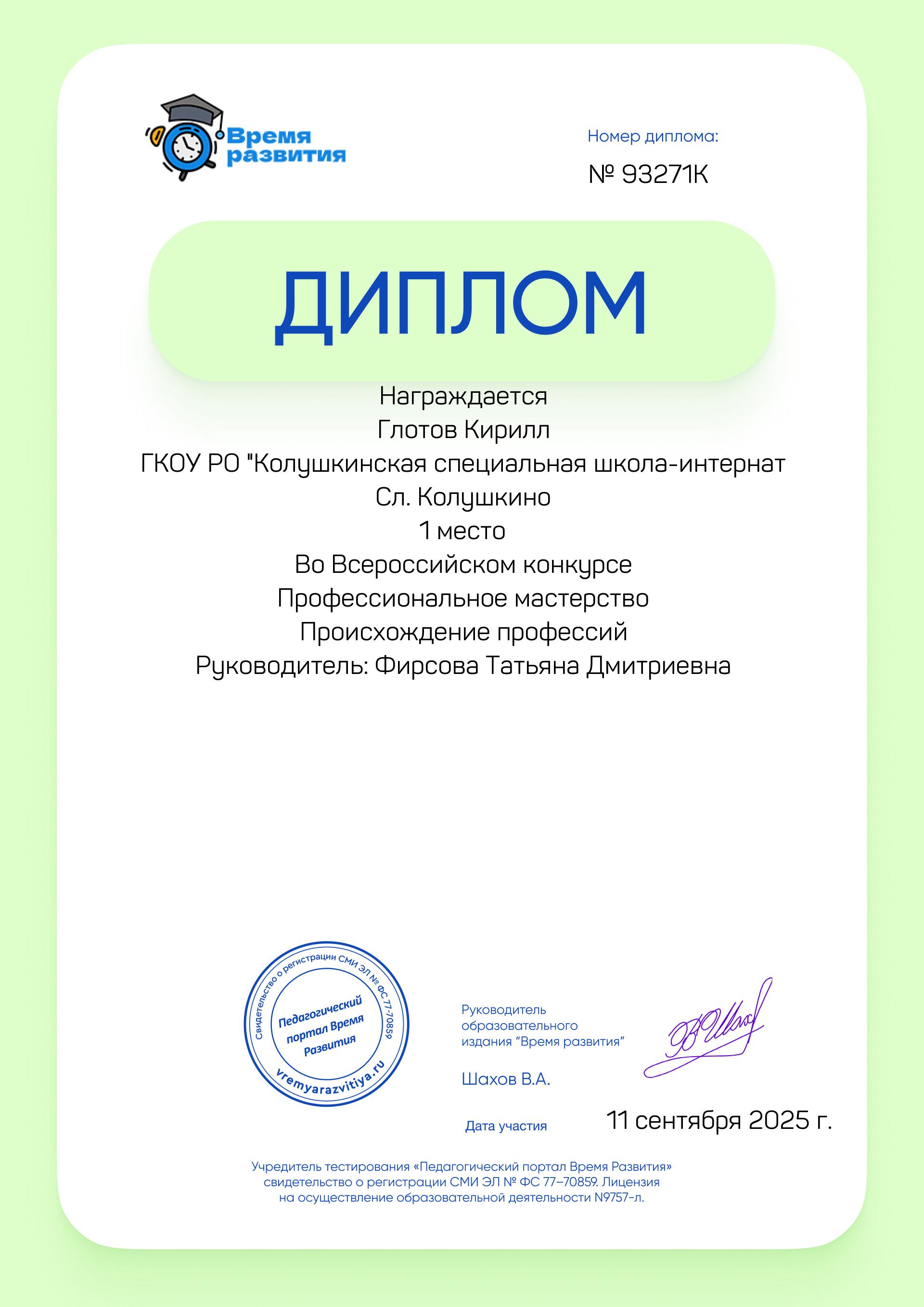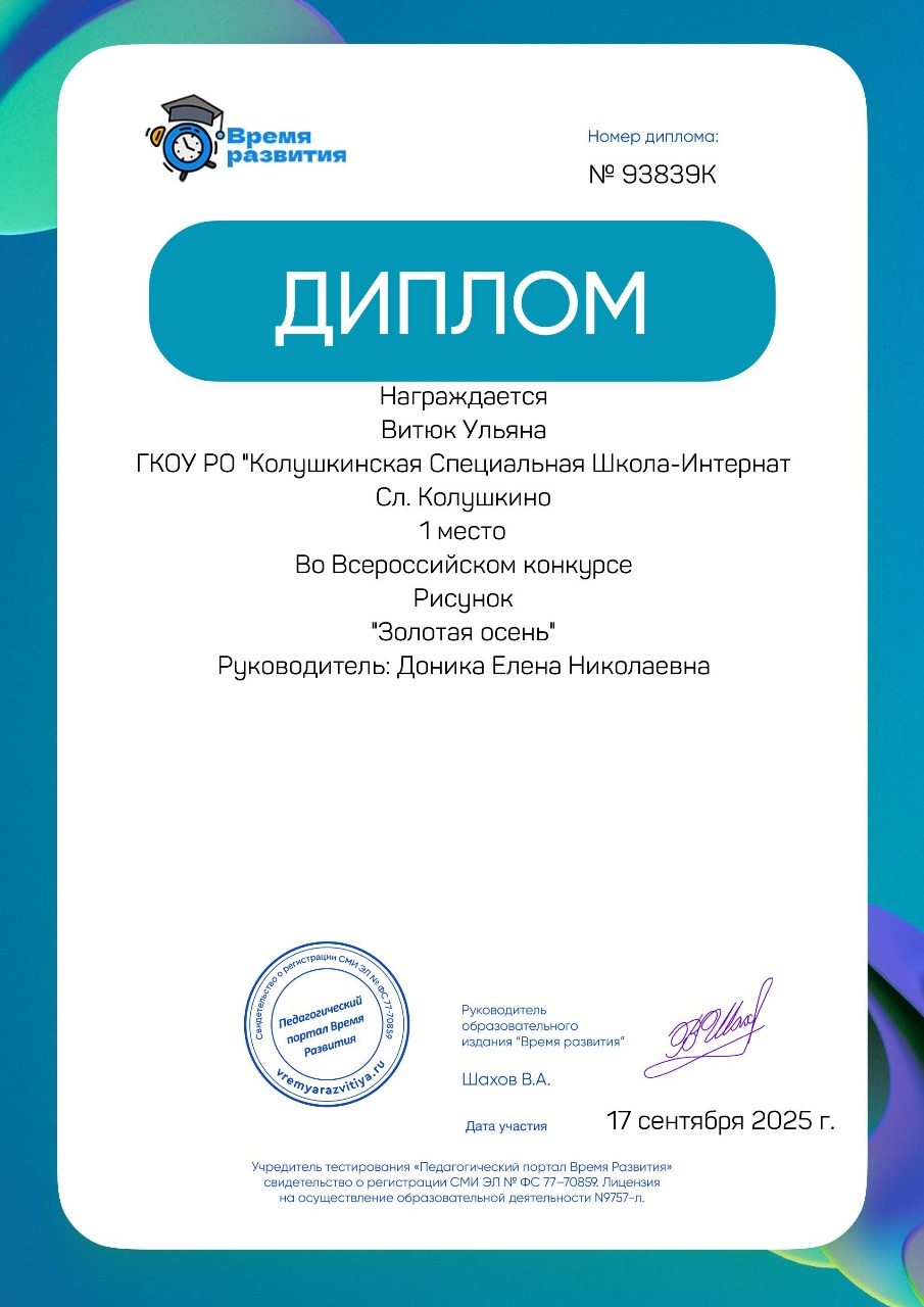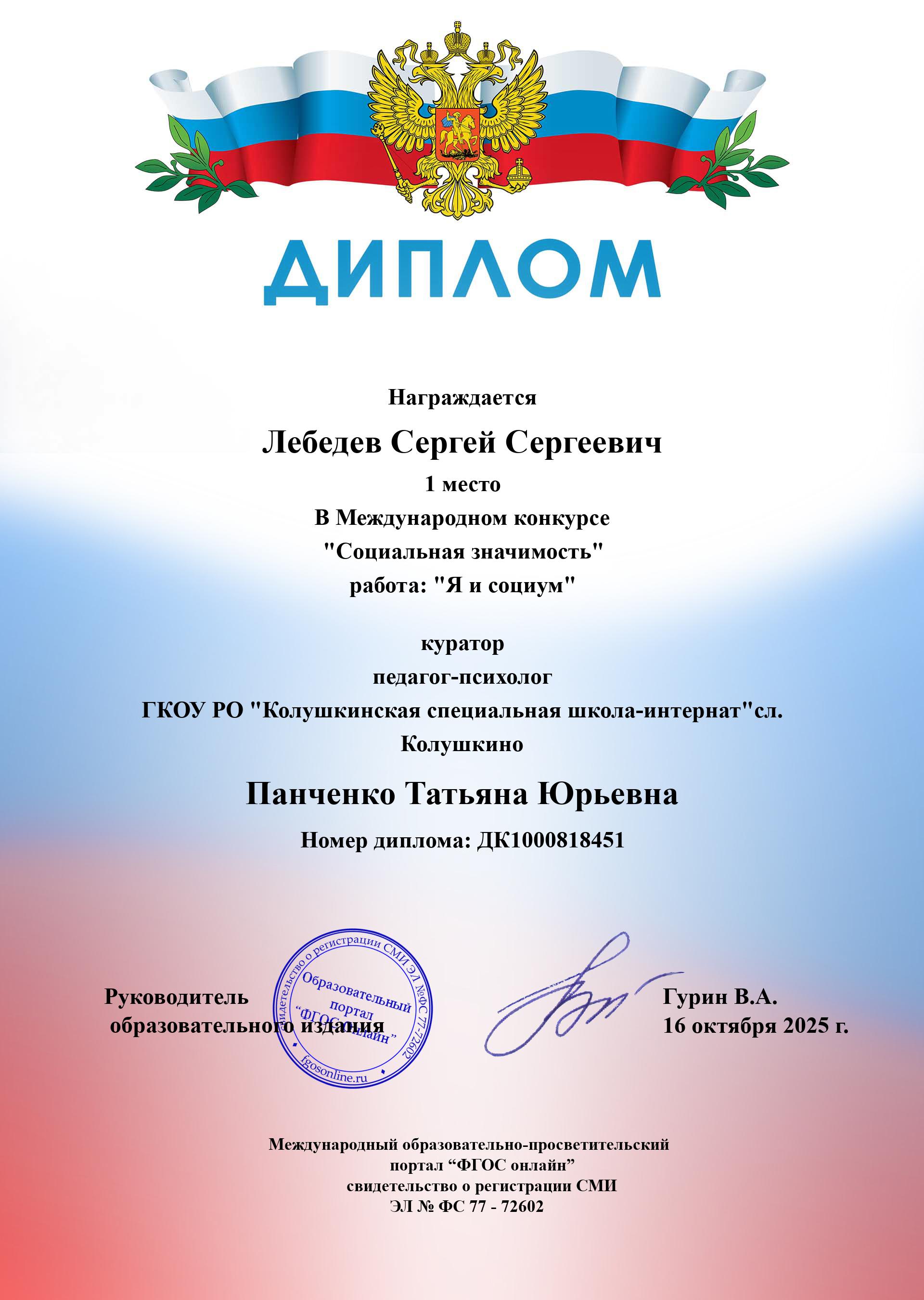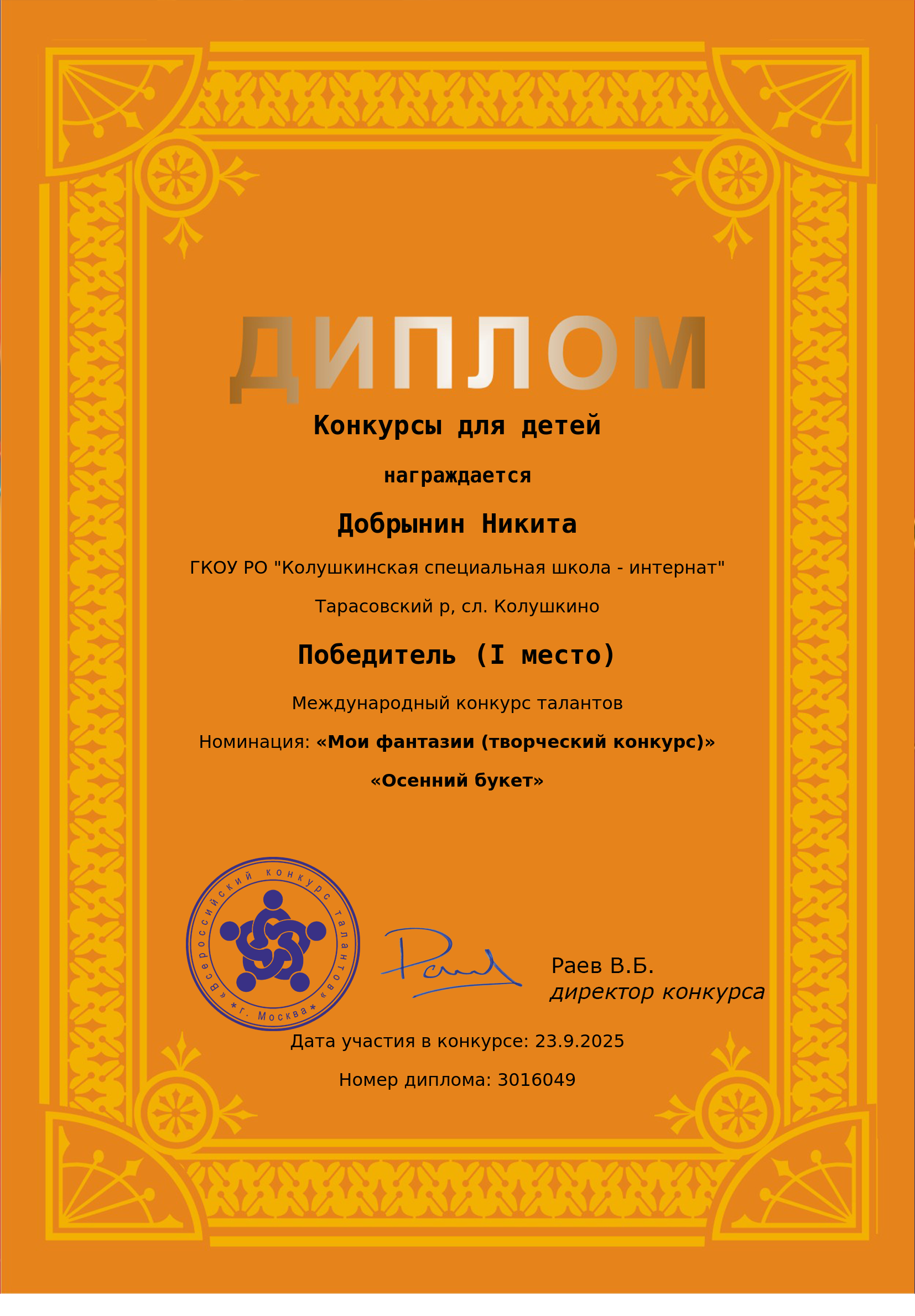 Достижения обучающихся 2025 год Всероссийский конкурс Диплом Агрызкова Михаила (скачать *..jpg) Диплом Барабанова Сергея (скачать *..jpg) Диплом Бурчик Данила (скачать *..jpg) Диплом Витюк Михаила (скачать *..pdf) Диплом Витюк Ульяны (скачать *..jpg) Диплом Гаркушина Артема (скачать *..jpg) Диплом Гаркушина Германа (скачать *..pdf) Диплом Гаркушиной Елизаветы (скачать *..jpg) Диплом Гаркушиной Светланы (скачать *..pdf) Диплом Глотова Кирилла (скачать *..jpg) Диплом Глотова Кирилла (скачать *..pdf) Диплом Даниловой Карины (скачать *..pdf) Диплом Дигонского Сергея (скачать *..pdf) Диплом Дигонской Анны (скачать *..jpg) Диплом Дьяченко Ильи (скачать *..jpg) Диплом Жарлицына Владимира (скачать *..jpg) Диплом Жучкова Константина (скачать *..pdf) Диплом Касатова Романа (скачать *..jpg) Диплом Кобцева Ивана (скачать *..jpg) Диплом Кобцева Юрия (скачать *.jpeg) Диплом Лаврентьева Вадима (скачать *..pdf) Диплом Лебедевой Виктории (скачать *..pdf) Диплом Мирошниковой Инны (скачать *..pdf) Диплом Мирошниковой Юлии (скачать *..JPG) Диплом Мирского Артема (скачать *..pdf) Диплом Николаева Ильи (скачать *..pdf) Диплом Пермяковой Светланы (скачать *..pdf) Диплом Рыбальченко Дениса (скачать *..pdf) Диплом Свиридова Николая (скачать *..pdf) Диплом Ставицкого Ивана (скачать *..jpg) Диплом Талалаева Дениса (скачать *..pdf) Диплом Талалаева Максима (скачать *..pdf) Диплом Чередниченко Андрея (скачать *..pdf) Диплом Шишкалова Михаила (скачать *..pdf) Международный конкурс Диплом Богданенко Натальи (скачать *..pdf) Диплом Букарева Артема (скачать *..pdf) Диплом Витюка Егора (скачать *..pdf) Диплом Гаркушина Романа (скачать *..pdf) Диплом Гаркушиной Юлии (скачать *..pdf) Диплом Григорьева Максима (скачать *..pdf) Диплом Данилова Сергея (скачать *..png) Диплом Добрынина Никиты (скачать *..png) Диплом Журавлева Артема (скачать *..pdf) Диплом Лебедева Сергея (скачать *..jpg) Региональный конкурс Диплом Иващенко Владимира (скачать *.jpeg) Диплом Кудьзиева Алексеея (скачать *.jpeg) Диплом Парамонова Алексея (скачать *..png)