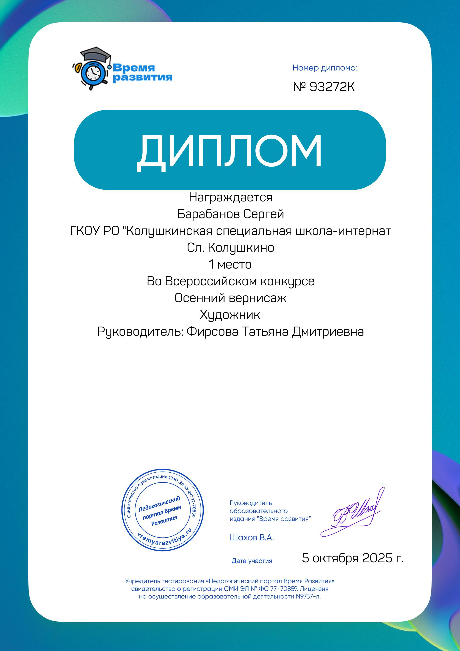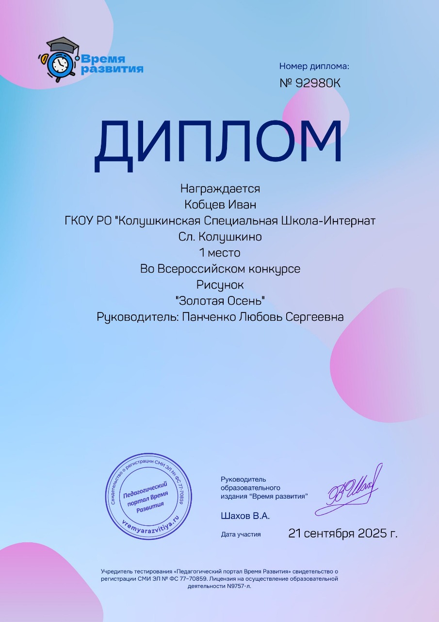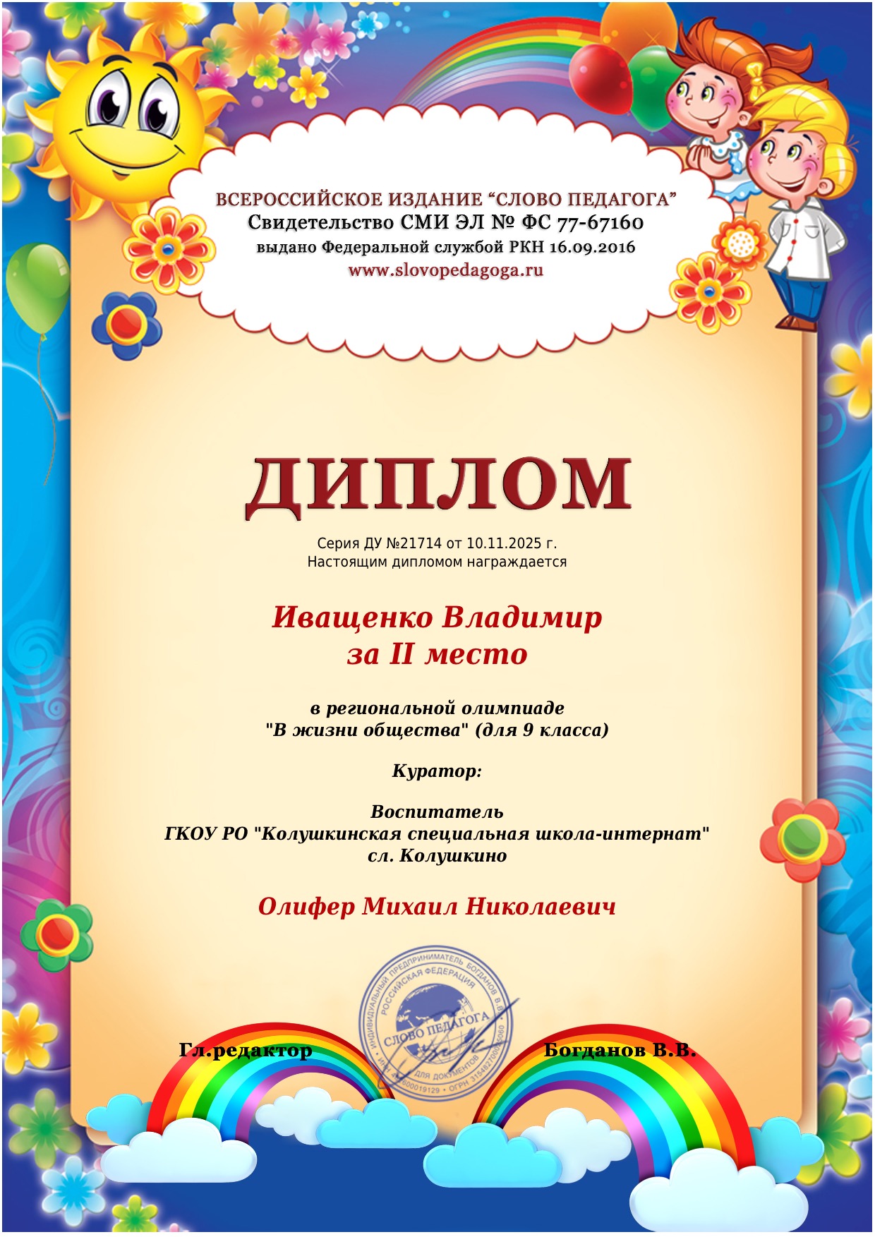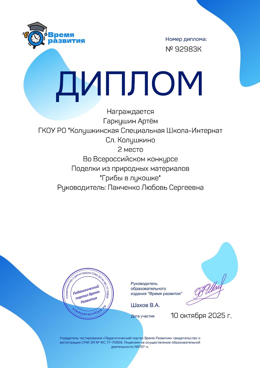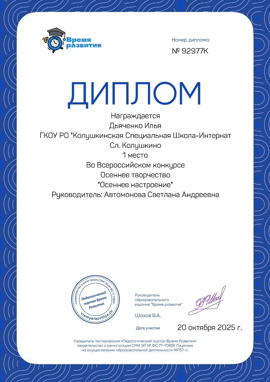 Достижения обучающихся 2025 год Всероссийский конкурс Диплом Агрызкова Михаила (скачать *..jpg) Диплом Барабанова Сергея (скачать *..jpg) Диплом Бурчик Данила (скачать *..jpg) Диплом Витюк Михаила (скачать *..pdf) Диплом Витюк Ульяны (скачать *..jpg) Диплом Гаркушина Артема (скачать *..jpg) Диплом Гаркушина Германа (скачать *..pdf) Диплом Гаркушиной Елизаветы (скачать *..jpg) Диплом Гаркушиной Светланы (скачать *..pdf) Диплом Глотова Кирилла (скачать *..jpg) Диплом Глотова Кирилла (скачать *..pdf) Диплом Даниловой Карины (скачать *..pdf) Диплом Дигонского Сергея (скачать *..pdf) Диплом Дигонской Анны (скачать *..jpg) Диплом Дьяченко Ильи (скачать *..jpg) Диплом Жарлицына Владимира (скачать *..jpg) Диплом Жучкова Константина (скачать *..pdf) Диплом Касатова Романа (скачать *..jpg) Диплом Кобцева Ивана (скачать *..jpg) Диплом Кобцева Юрия (скачать *.jpeg) Диплом Лаврентьева Вадима (скачать *..pdf) Диплом Лебедевой Виктории (скачать *..pdf) Диплом Мирошниковой Инны (скачать *..pdf) Диплом Мирошниковой Юлии (скачать *..JPG) Диплом Мирского Артема (скачать *..pdf) Диплом Николаева Ильи (скачать *..pdf) Диплом Пермяковой Светланы (скачать *..pdf) Диплом Рыбальченко Дениса (скачать *..pdf) Диплом Свиридова Николая (скачать *..pdf) Диплом Ставицкого Ивана (скачать *..jpg) Диплом Талалаева Дениса (скачать *..pdf) Диплом Талалаева Максима (скачать *..pdf) Диплом Чередниченко Андрея (скачать *..pdf) Диплом Шишкалова Михаила (скачать *..pdf) Международный конкурс Диплом Богданенко Натальи (скачать *..pdf) Диплом Букарева Артема (скачать *..pdf) Диплом Витюка Егора (скачать *..pdf) Диплом Гаркушина Романа (скачать *..pdf) Диплом Гаркушиной Юлии (скачать *..pdf) Диплом Григорьева Максима (скачать *..pdf) Диплом Данилова Сергея (скачать *..png) Диплом Добрынина Никиты (скачать *..png) Диплом Журавлева Артема (скачать *..pdf) Диплом Лебедева Сергея (скачать *..jpg) Региональный конкурс Диплом Иващенко Владимира (скачать *.jpeg) Диплом Кудьзиева Алексеея (скачать *.jpeg) Диплом Парамонова Алексея (скачать *..png)
